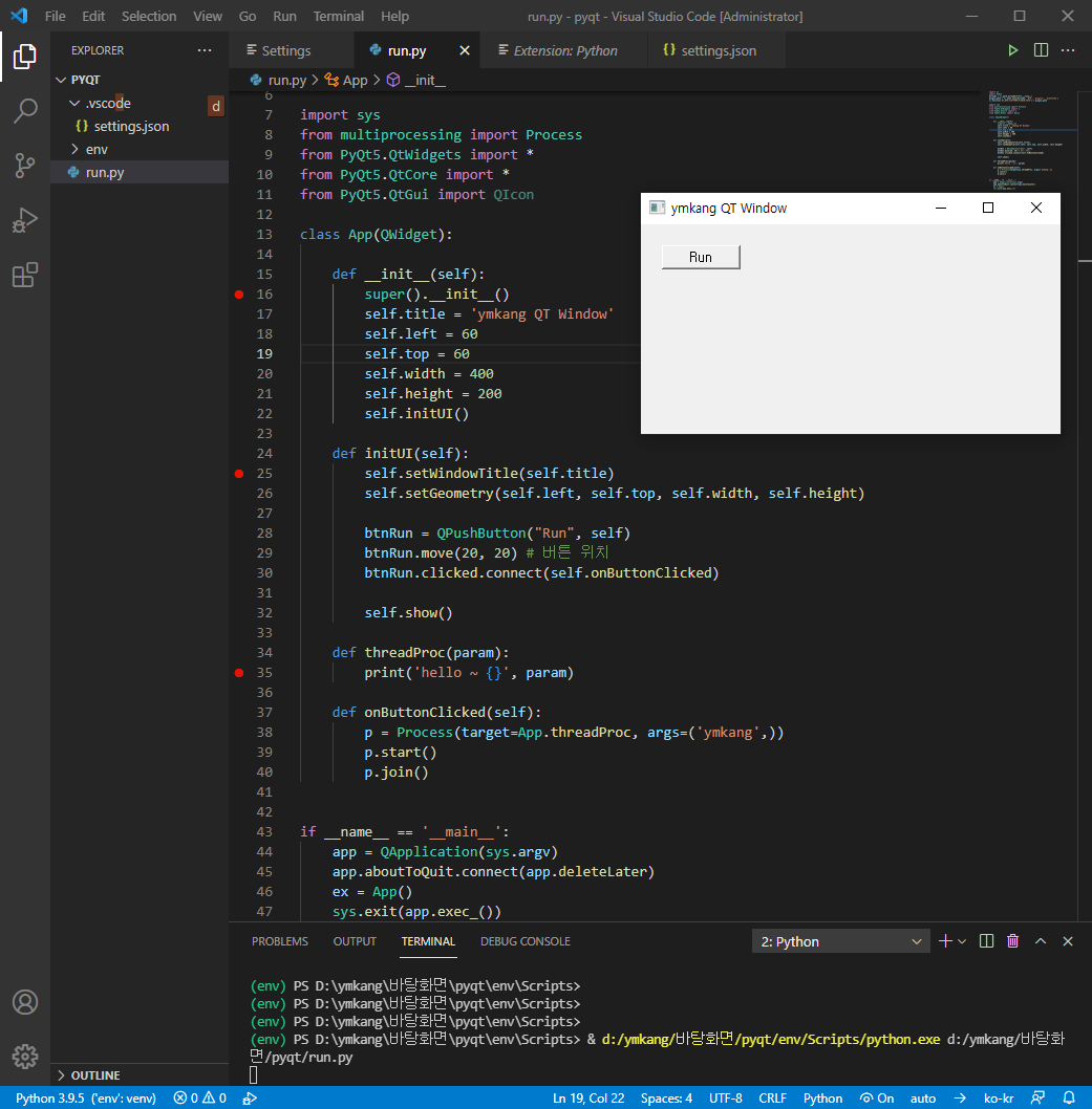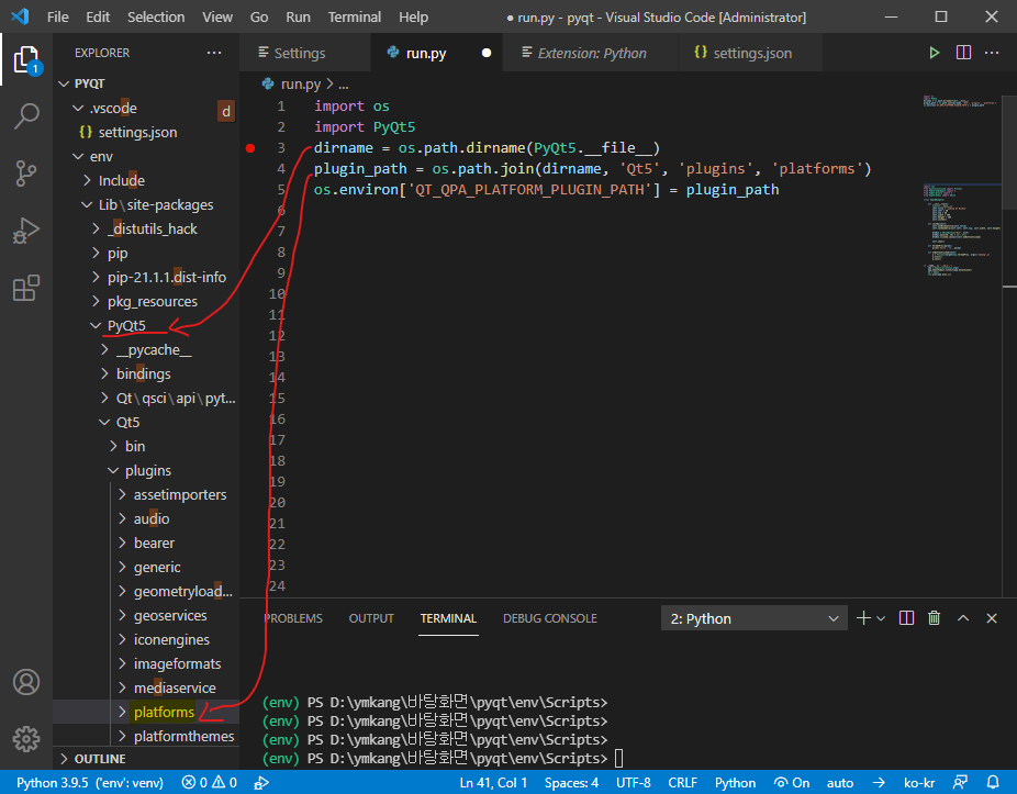 PyQt 를 가상환경에서 사용하기 위해 환경 변수를 추가해야 하는데 파이썬 코드 시작부에서 해당 작업을 수행할 수 있다.
