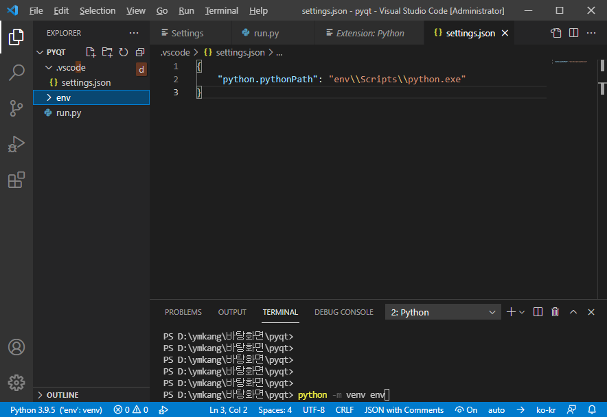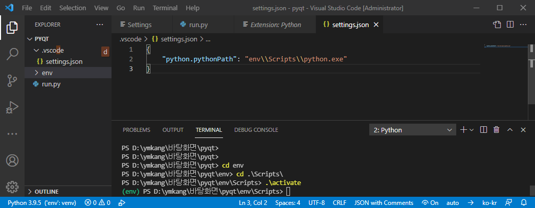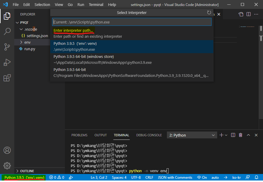 - 가상환경 경로 하위에 <프로젝트 경로>/env/Scripts/python.exe 를 지정한다.