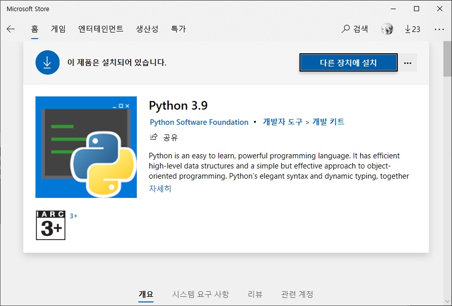 또는 MS Store 에서 Python 3.9 를 설치한다. 본인은 환경변수에 MicrosoftApps 경로가 잡혀있어서 환경 변수 추가 없이 사용하기 위해 MS Store 에서 Python 을 설치함.