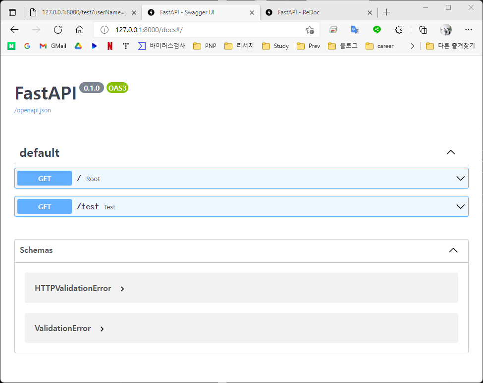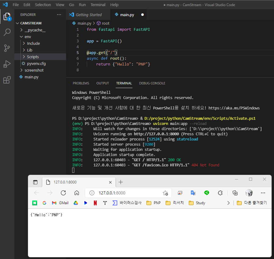 아래 간단한 예제를 통하여 fastAPI 서버를 테스트하였다.