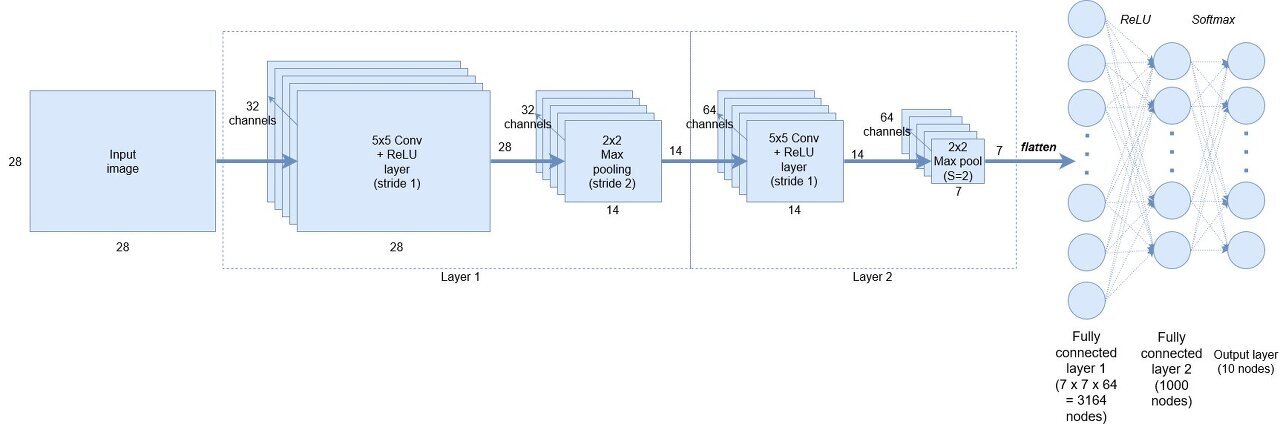 상기 모델은 CNN 알고리즘 Max Pooling 방식으로 압축하고 1차원으로 만든 후에 ReLU 와 Softmax 활성화 함수를 사용한 모델 예시이다.