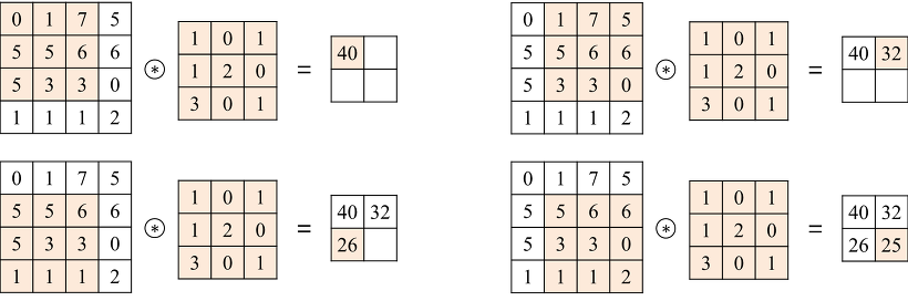 CNN 은 원본 이미지(좌) 와 필터(중)의 합성곱을 통하여 특징점 맵(우)을 생성한다. 합성곱 계산 시 한 칸씩 이동하며 계산한다. stride 가 1이면 한 칸씩 이동하며 합성곱을 수행하고 stride가 2이면 두 칸씩 이동하며 합성곱을 수행한다고 보면 된다. stride 가 커지면 아웃풋 특징점 맵의 크기는 더 작아진다.