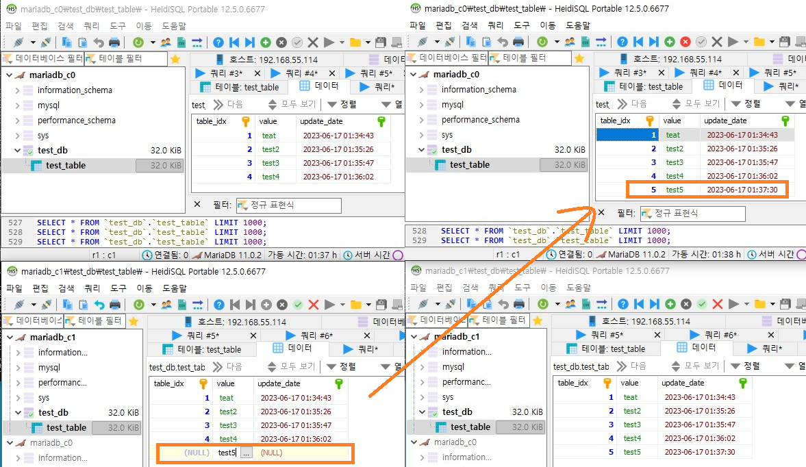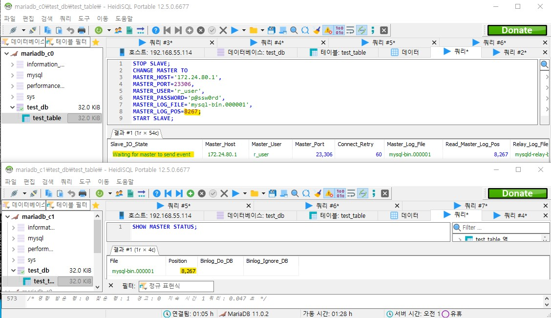 이제 양방향으로 master/slave 설정이 모두 되었으므로 테스트를 해보겠다.