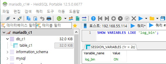 mariadb_c1에 replication master 설정이 완료되었으므로 이제 mariadb_c0에 salve 설정을 적용한다.