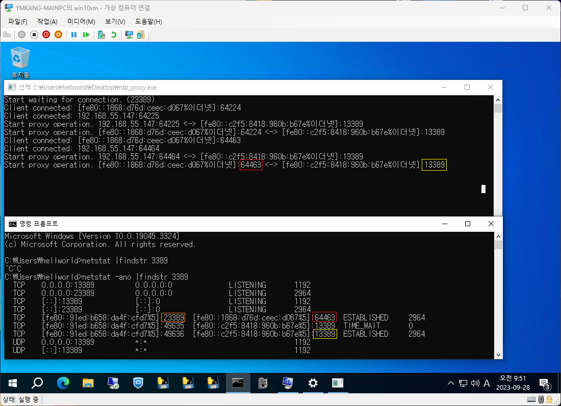 Local PC 에서 mstsc.exe를 실행해서 VM-A:23389로 접속하면 실제로는 VM-B:13389 호스트로 접속되는 것을 볼 수 있다. rdp_proxy.exe 콘솔 화면과 netstat -ano |findstr 3389를 확인해 보면 RDP 접속에 대해서 프록시 동작을 하는 것을 볼 수 있다. 비동기로 처리되기 때문에 다중 프록시에 대한 기능도 동작할 것으로 생각된다.