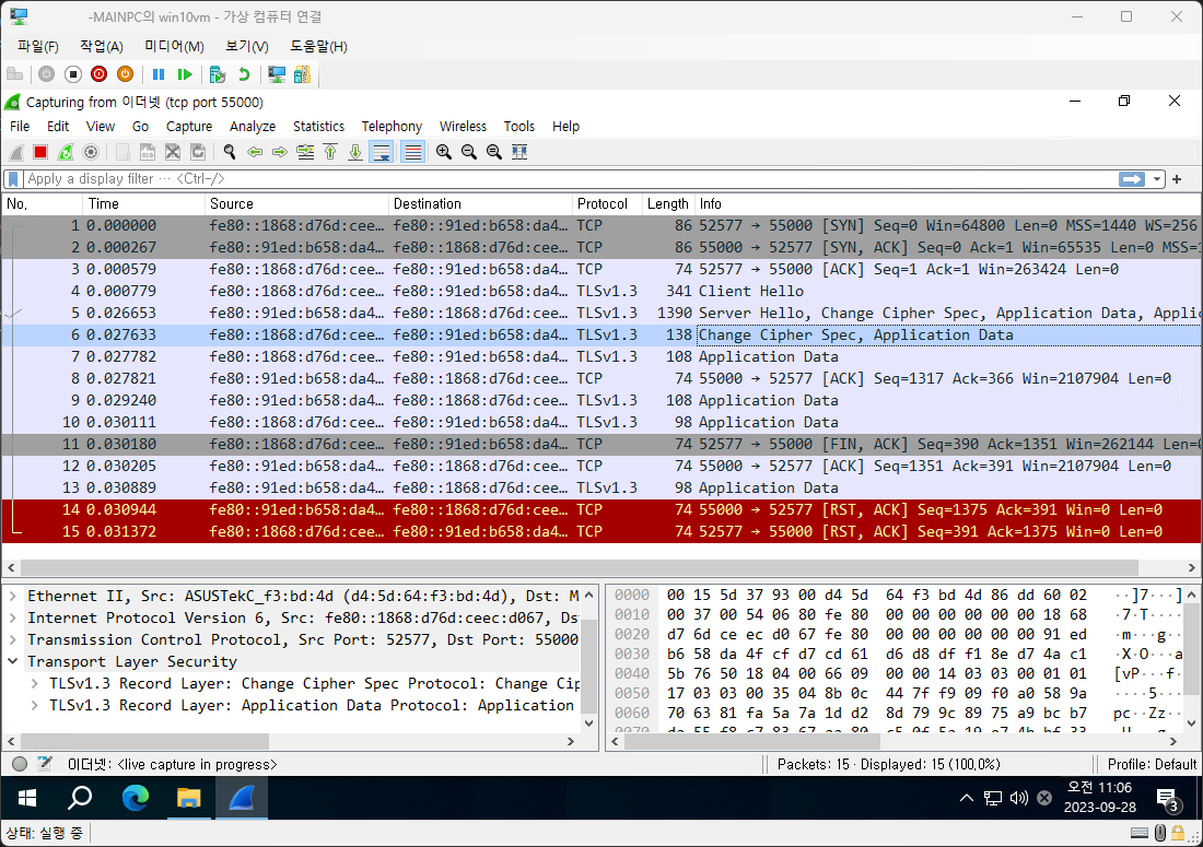 서버와 클라이언트 사이에 통신을 정상적으로 되는 것을 볼 수 있다. 이제 TLS 통신이 되었는지 확인하기 위해서 wireshark로 확인해 보자.