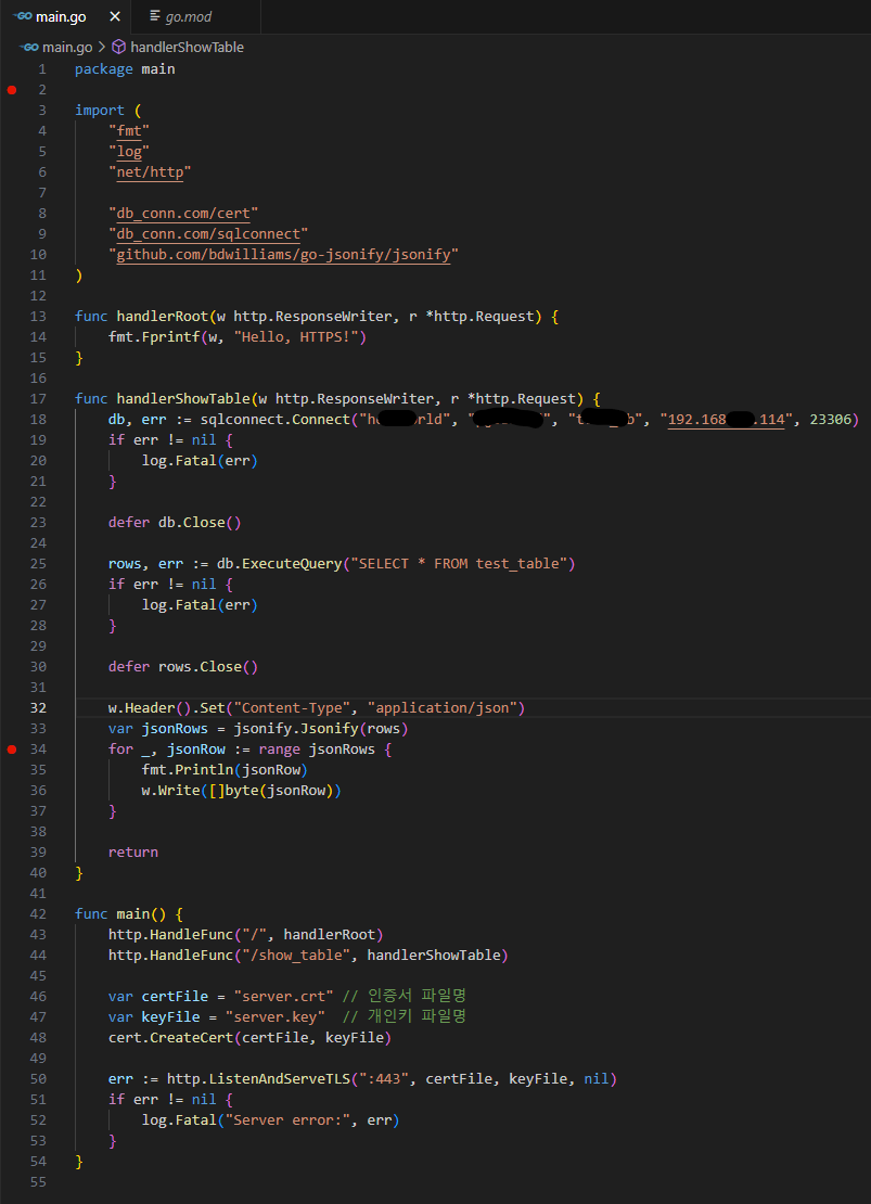 REST API 는 기존에 만들었던 TLS1.3 통신 포스팅을 참조하여 사설 인증서를 생성해서 HTTPS 통신을 사용하도록 작성되었다. 핸들러는 root 핸들러와 show_table 핸들러를 등록했고, show_table API를 호출하면 sql 에 질의하여 테스트용 테이블의 값을 json 폼으로 출력하도록 작성되었다.