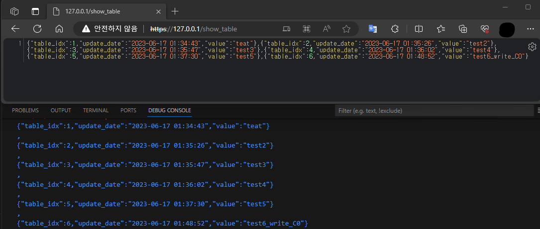 웹 브라우저를 통해서 127.0.0.1/show_table 를 호출하면 위와 같은 결과를 확인할 수 있다.